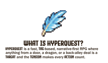 HyperQuest is a rules-lite system made for fast and cinematic stories. Navigating a social gala, slaying a dragon, and desperately trying to kick down that stupid door all use the same mechanics.