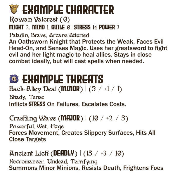 - Tension: A simple 2d6 system where every success chips away at a Threat’s Tension, and every failure raises the stakes.